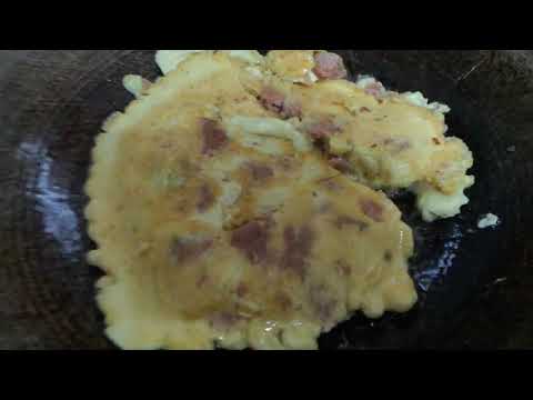 Sambil menggoreng, hancurkan telur bagi dijadikan telur hancur.